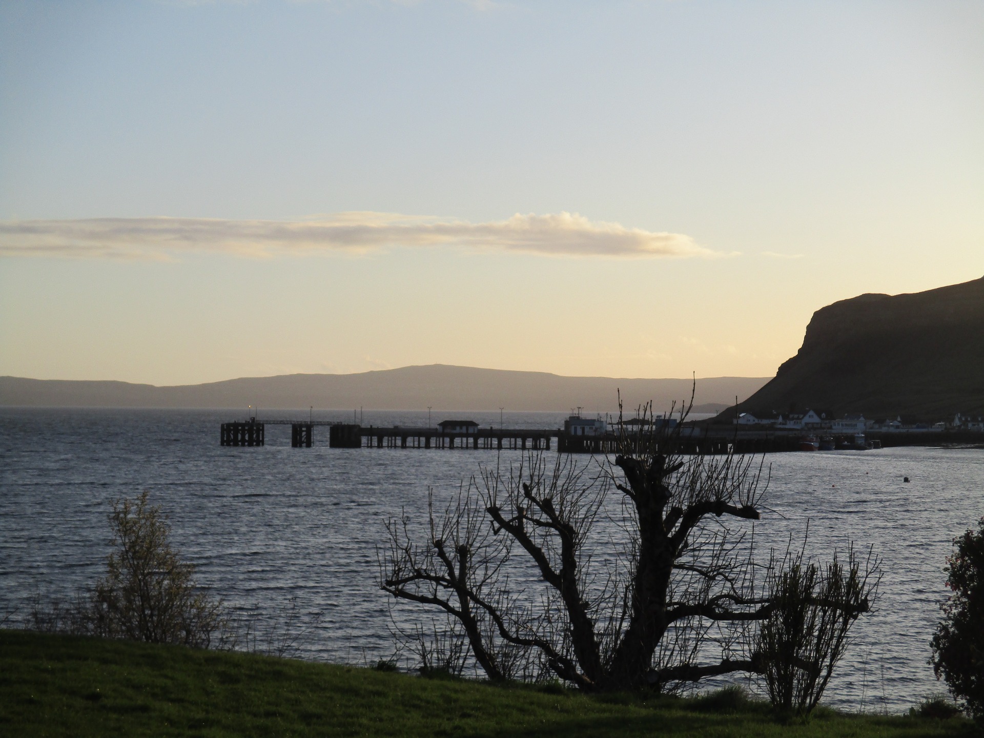 Za nedlouho jsme uzřeli i moře a já brzy poznala přístavní molo v Uigu z map na netu. Přibližně jsme i věděli, kde je náš penzion. Bus zastavil právě u toho mola, takže jsme se museli vracet a s kufry obejít celou zátoku, což nebyla žádná prdel.