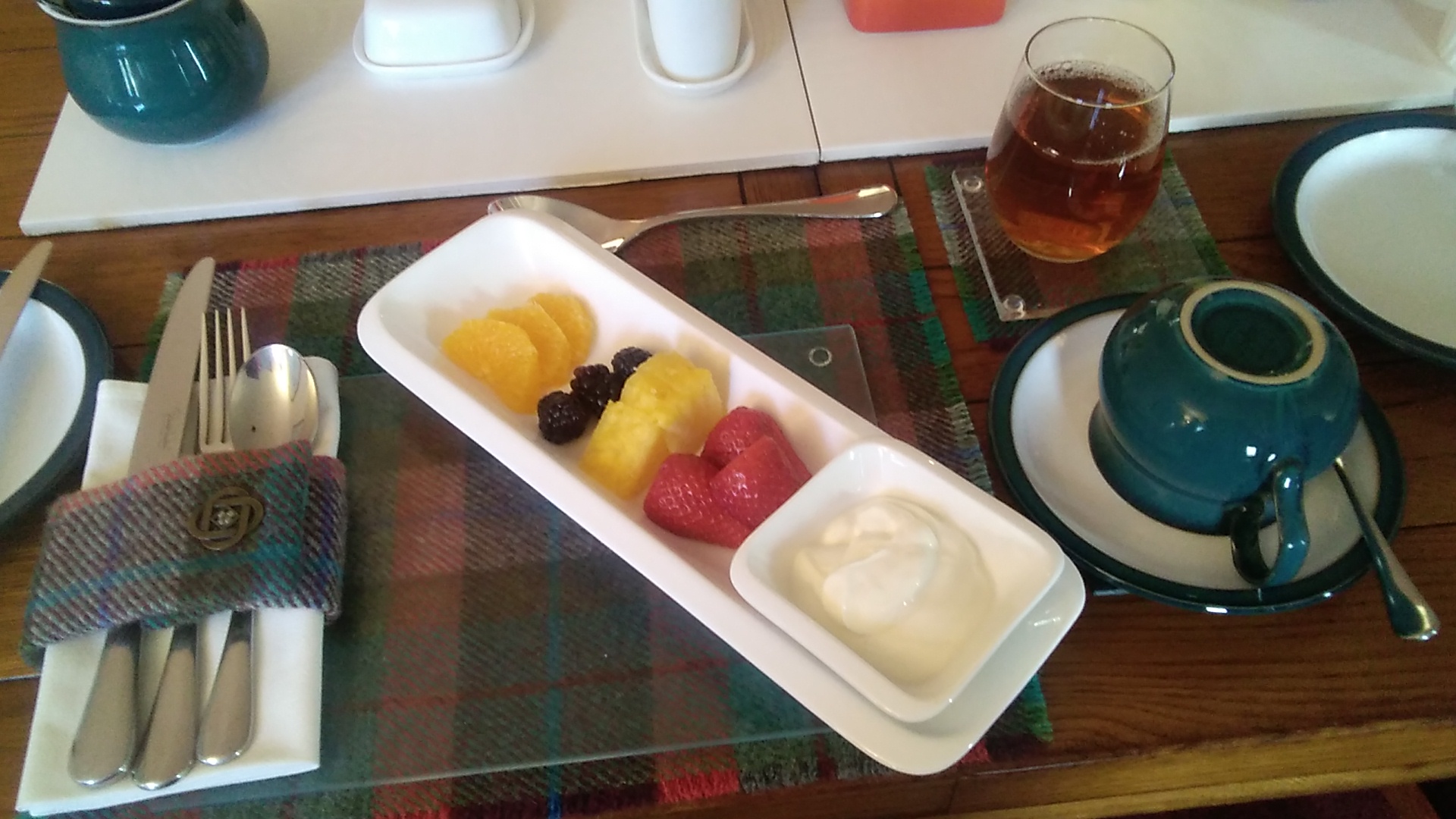 Když jsme se vrátili, ostatní hosté už vesele snídali. Měli jsme strach, jak se domluvíme na snídani, ale Martin už byl připraven s tabletem. Ovšem nebyl třeba. Margaret a Sandy byli na nás připraveni. Měli lístečky, kam vypsali, co si můžeme dát, jak anglicky, tak i česky. Budu se asi opakovat, ale prostě musím. Oni jsou prostě úžasní.