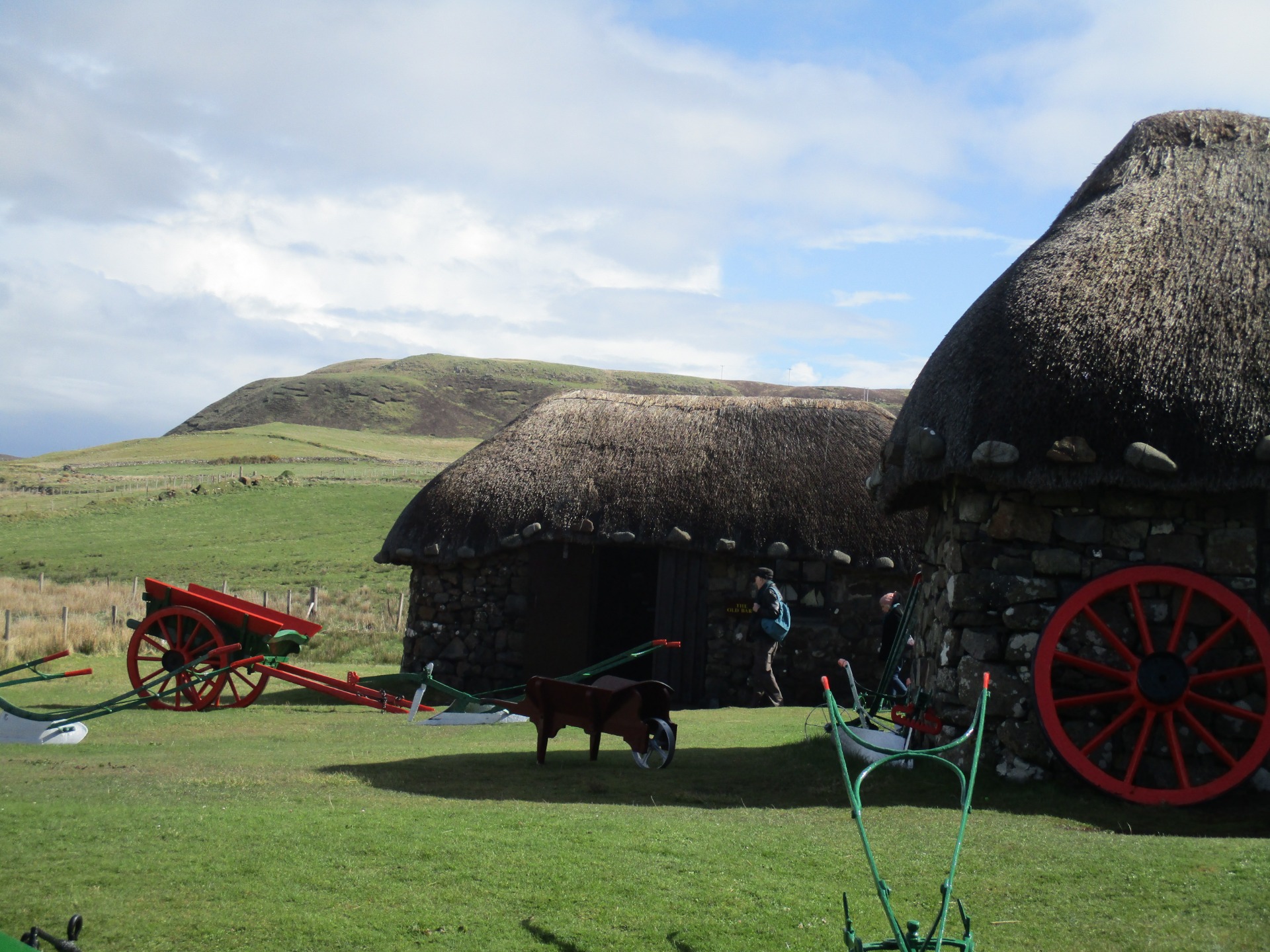 Z muzea jsme se mrkli na hřbitov, co byl jen o kus dál, neboť uprostřed něj stál ohromný keltský kříž. Cestou nás zastihnul slušný slejvák, ale vzápětí nás osušil silný vítr. Měli jsme hafo času, takže jsme se rozhodli jít na Duntulm Castle, docela vzdálený. Brzy jsme ho zahlédli ve velké dálce, ale pokračovali jsme směrem k němu. Cesta byla úžasná a určitě jsem nelitovala, že jsme došli až k cíli. Nádherné místo. Hodně jsme fotili i točili. Samozřejmě jsme si zapomněli vzít pití, ale možná to bylo tak lepší. Nemusela jsem chodit na záchod. Ono totiž nebylo kam. Všude kam bylo vidět, by byla vidět i má holá řiť. :-D A pokud byl někde náhodou nějaký lesík, byl oplocen. :)
