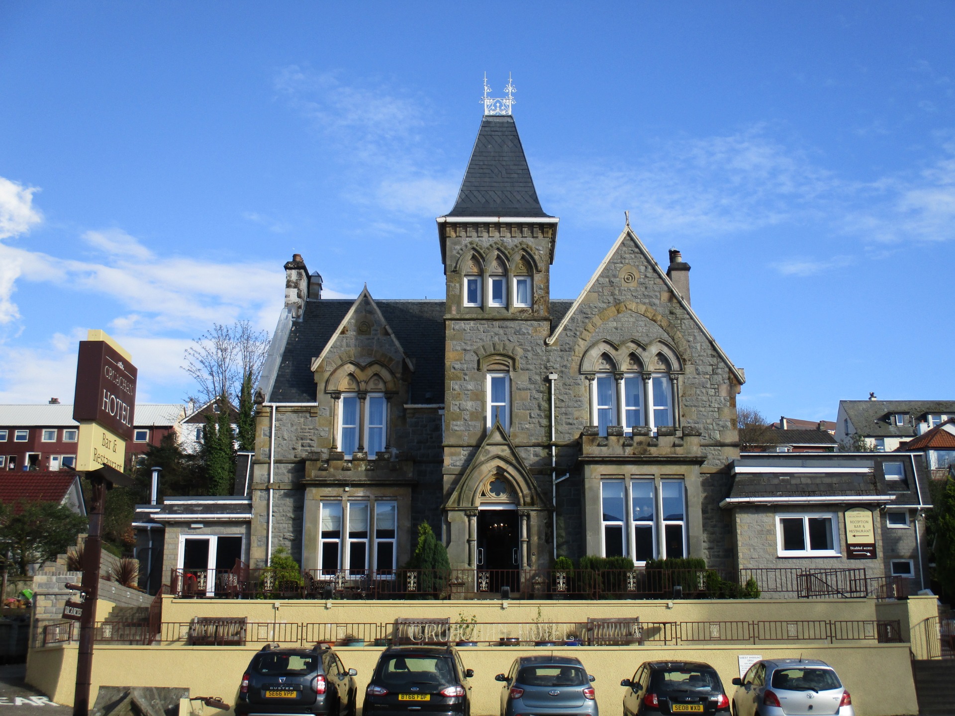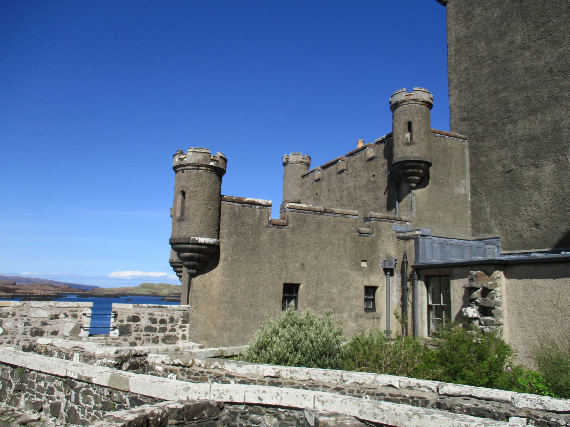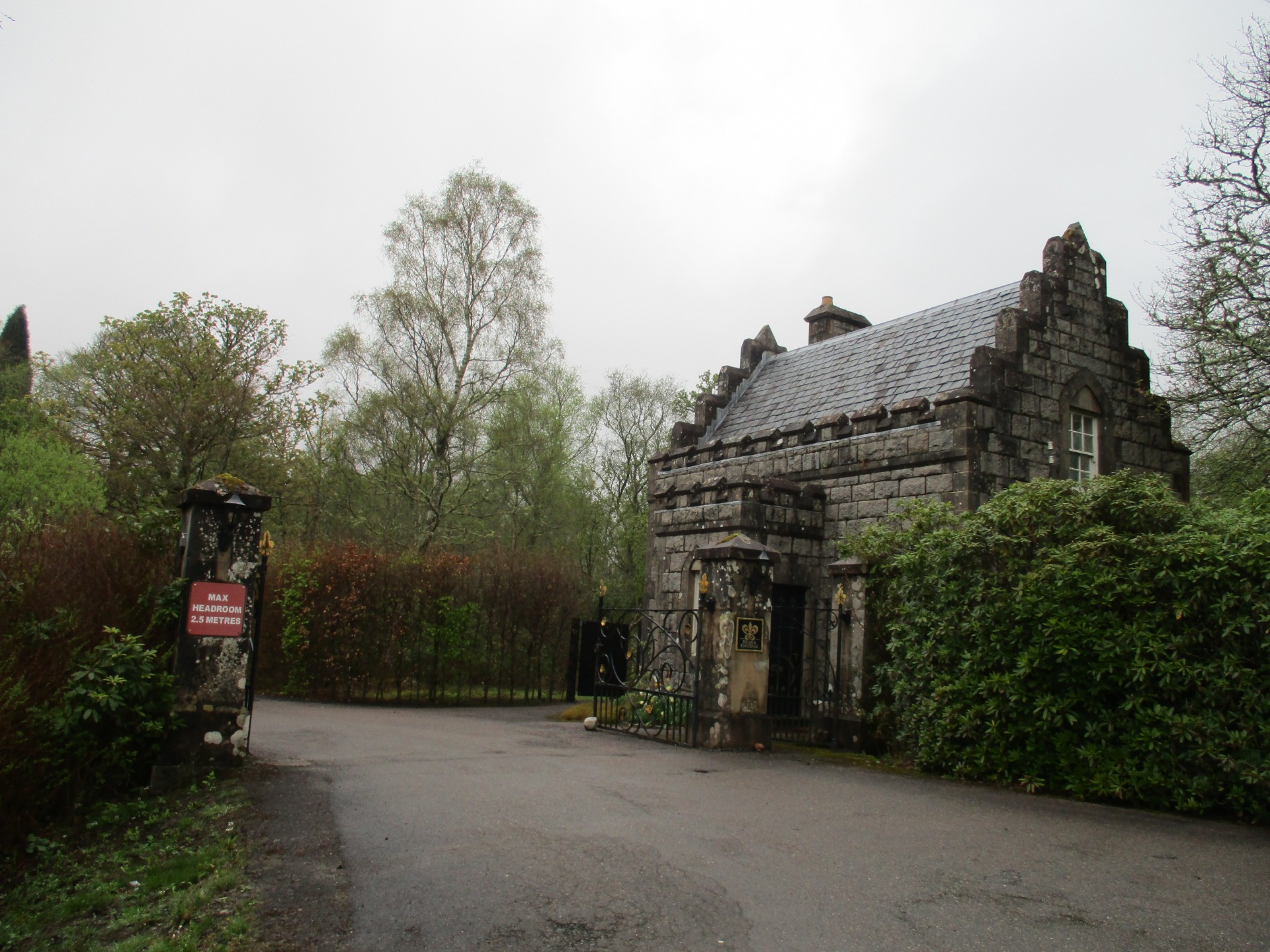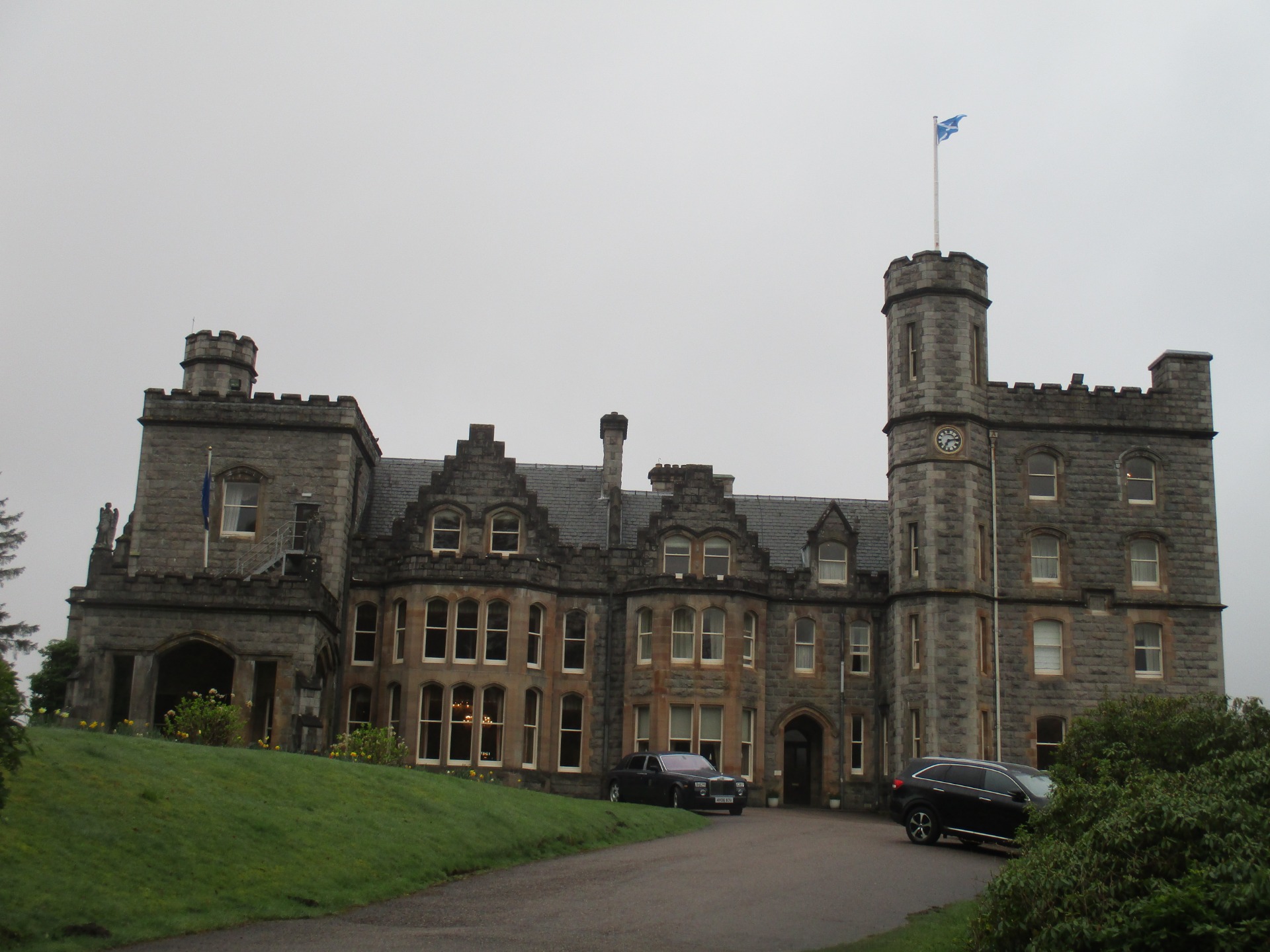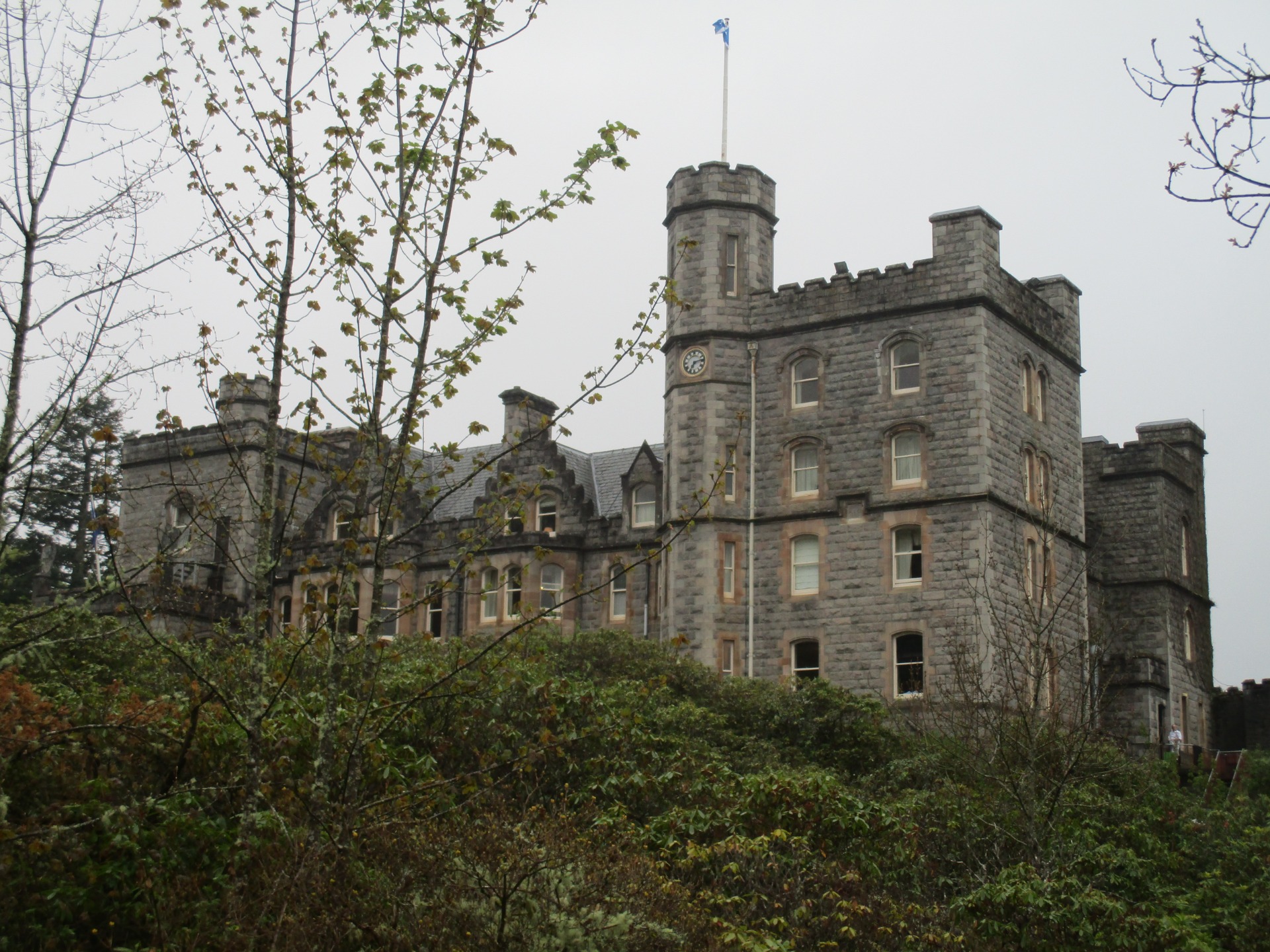 Když jsme vystoupili, hned nás cedule zavedla do krásných zahrad kolem hradu. Hotel Inverlochy Castle nebyl odnikud vidět, neboť stál uprostřed husté zeleně na svém rozlehlém pozemku, který byl lemován cestičkami ze sypaných kamínků. Jakmile jsme k němu konečně dorazili, oba jsme žasli. Moc pěkný hrad. Hned bylo zahájeno fotografování a trochu jsme se prošli kolem. Dokonce jsme ho i obešli. Za hradem byly další pozemky s jezerem patřící k němu.