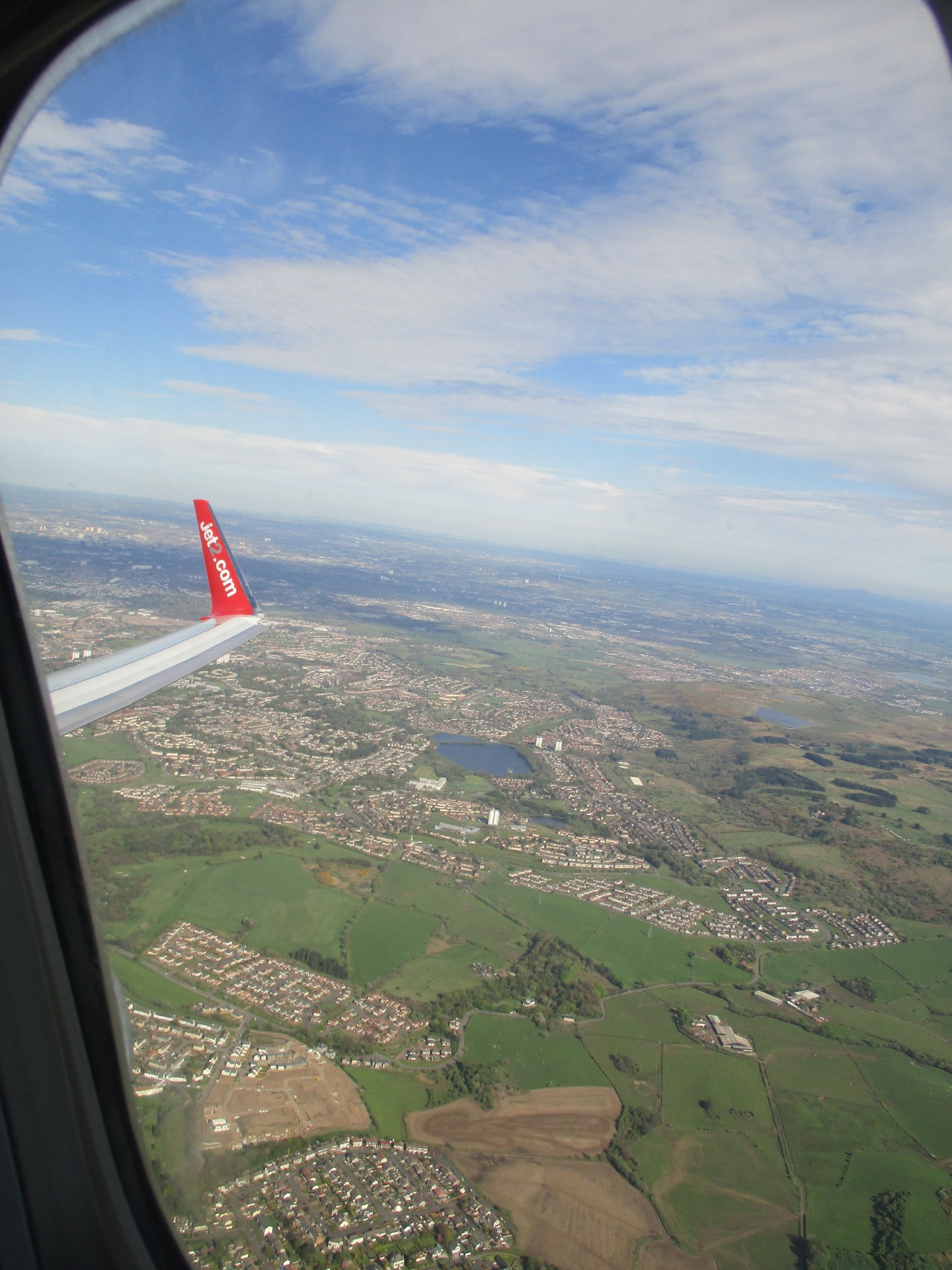 Rychle jsme zašli na toaletu, zakouřit a odbavit zavazadlo. Společnost jet2 měla odbavovací přepážky až někde na konci letiště a mimo hlavní halu. Vystáli jsme si frontu a dostali se k mladé slečně. Martin jí nerozuměl ani slovo a já už vůbec ne, jen jsem vypozorovala, co chce. Měli jsme dát zavazadlo na váhu. Označila ho a ukázala na ceduli, kde byly věci, co se převážet nesmí. Když jsme pokývali hlavami, že tam nic takového nemáme, kufr odjel. Opět se na něco ptala, ale zase jsme jí nerozuměli ani slovo. Trochu jsem pochopila, co myslí. Měla jsem příruční zavazadlo, ale na něm bylo ještě jedno, Martina. Nejspíš si myslela, že to musí také odbavit. Jakmile jsme tu brašnu nadzvedli, nejspíš pochopila. Dala nám konečně pasy, palubní lístky a my si oddychli. Museli jsme se vrátit do hlavní haly, kde jsme našli, kam jít dál. Museli jsme po schodech nahoru, kde nás čekala bezpečnostní prohlídka. Vše i s příručním zavazadlem do vaničky a poslat po páse. Postupně jsme procházeli rámem. Martin si zapomněl sundat brýle i prsten, ale nic se nedělo. :) Zase musíte projít spoustu obchodů, než se dostanete nakonec, kde jsou odlety. My měli ještě čas, takže jsme se vrátili, koupili si pití a Martin chtěl ještě utratit skotské libry, které se u nás vyměnit nedají, jen ty britské. Tak jsem si vybrala krásnou plyšovou horskou kravičku s čepečkem a celou dobu jsem jí měla při sobě. Bylo nám děsné horko, ale museli jsme vydržet, než se ukáže na tabuli, kam máme vlastně jít. Jakmile to tam naskočilo, mohli jsme pokračovat dál dlouho chodbou, než jsme se ocitli u správného vstupu. Tam se to začalo hromadit. Další kontrola pasů a lístků. Chvíli trvalo, než nás pustili k letadlu, ke kterému jsme museli ven a poté po schodech do něj. Museli jsme zadními dveřmi, tudíž celým letadlem dopředu. Konečně jsme byli na svých místech. Ještě jsem vyndala časopisy a kravičku posadil mezi mě a Martina, který tentokrát seděl u okýnka, aby mohl fotit, protože vzlétáme za světla.